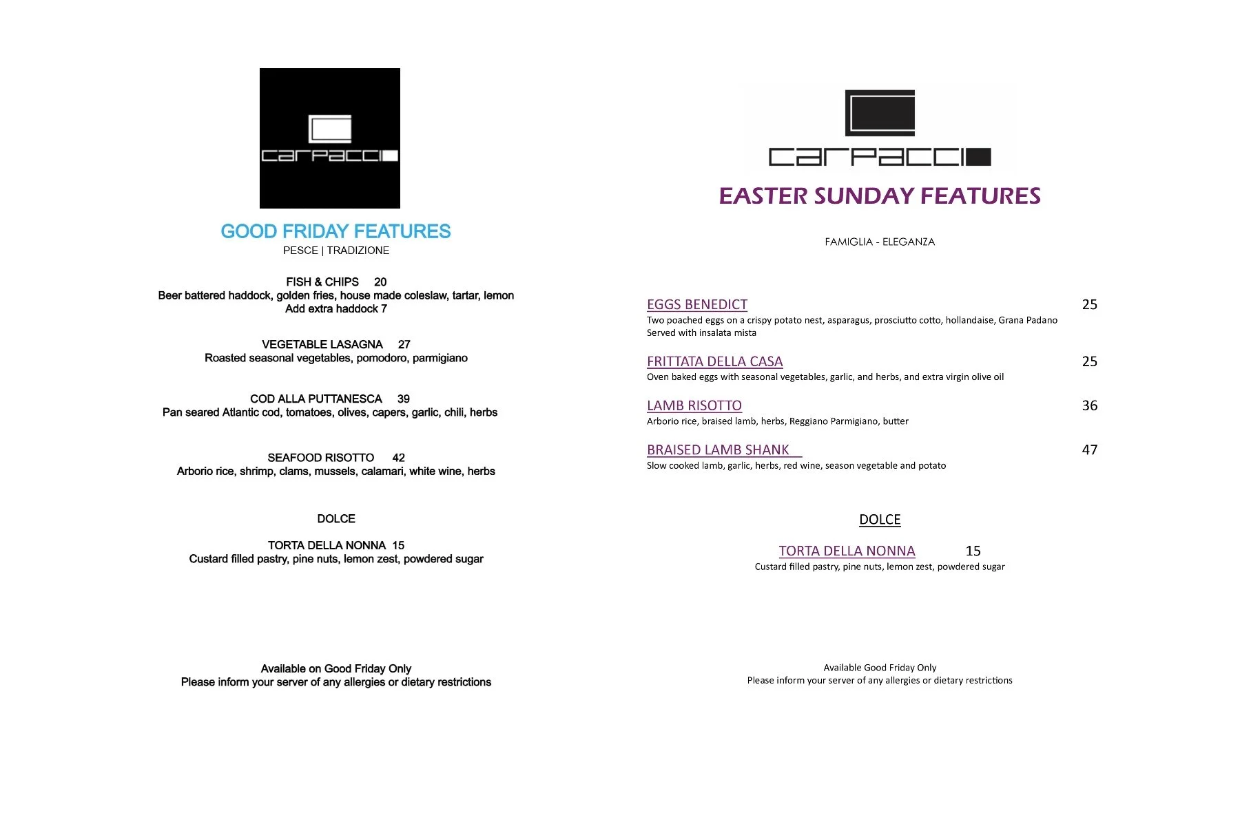 We’re Featuring A La Carte Menus Good Friday 5pm To 9pm And Easter Sunday 12pm To 9pm
